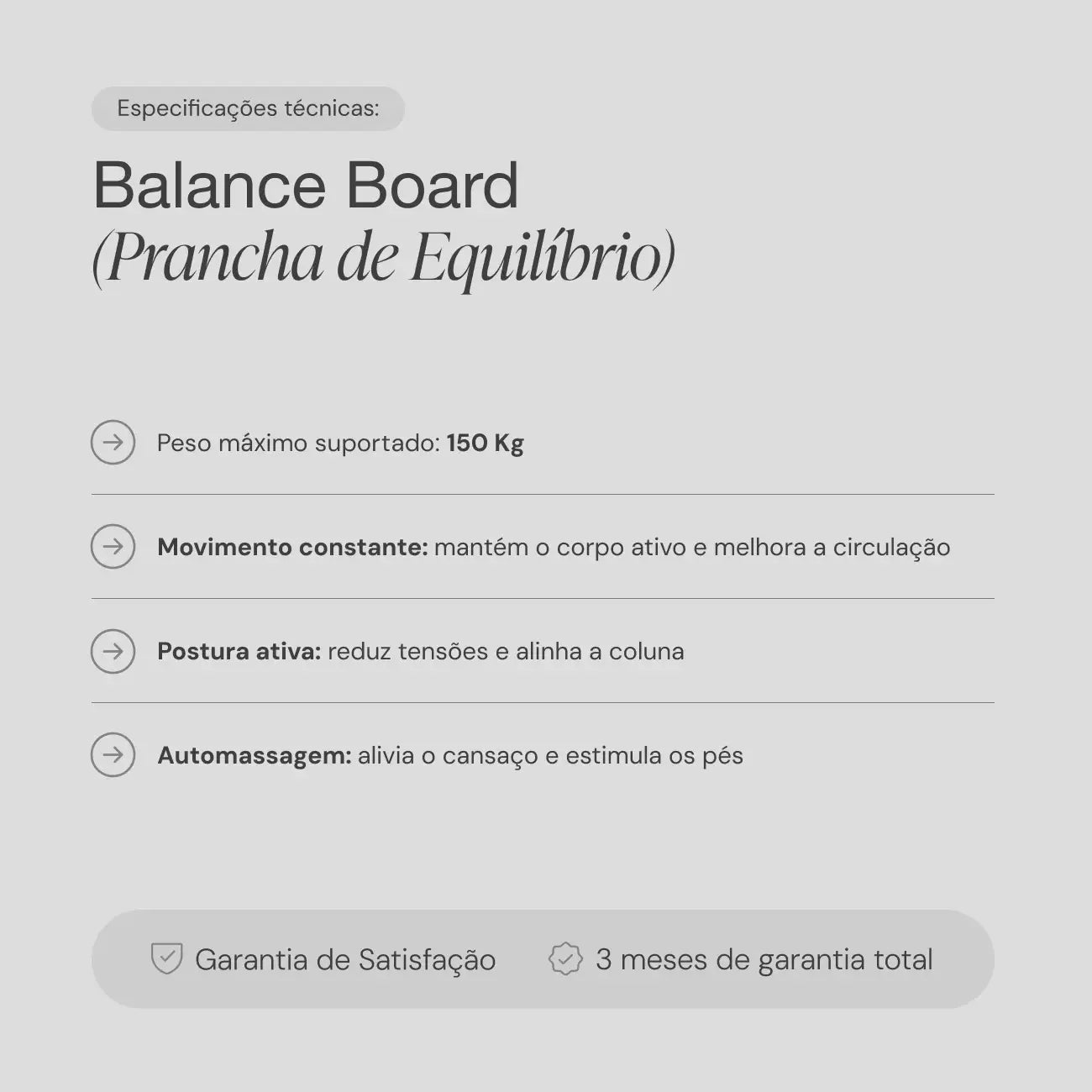 - Peso máximo suportado: 150 Kg