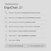 A Cadeira Premium ErgoChair dispõe de um mecanismo para percepção do peso do ocupante, onde o encosto com o ajuste e proteção para lombar reclinam-se conforme o peso se projeta na cadeira. Além disso, é possível regular a tensão desse mecanismo com o dispositivo posicionado na parte inferior do assento. O apoio de lombar da ErgoChair possui regulagem de altura em poliuretano. Seu assento é estofado em poliéster e seu encosto em tela Mesh. Há também o ajuste de altura dos apoios de braço, que também são produzidos em poliuretano, proporcionando maciez e resistência. E, um dos ajustes favoritos é a regulagem de profundidade do assento, onde é possível ajustar a distância entre o assento e o encosto, permitindo que haja maior espaço para ocupar a cadeira.