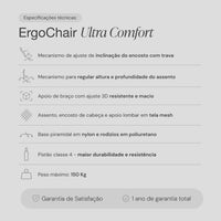 A Cadeira Premium ErgoChair Ultra Comfort dispõe de um encosto em tela mesh com regulagem de altura em até 5 níveis para acomodar biotipos diversos. Seu assento e encosto em tela Mesh premium para maior conforto respirabilidade. Há também o ajuste 3D dos apoios de braço, que também são produzidos em poliuretano, proporcionando maciez e resistência. E, um dos ajustes favoritos é a regulagem de profundidade do assento, onde é possível ajustar a distância entre o assento e o encosto, permitindo que haja maior espaço para as pernas.