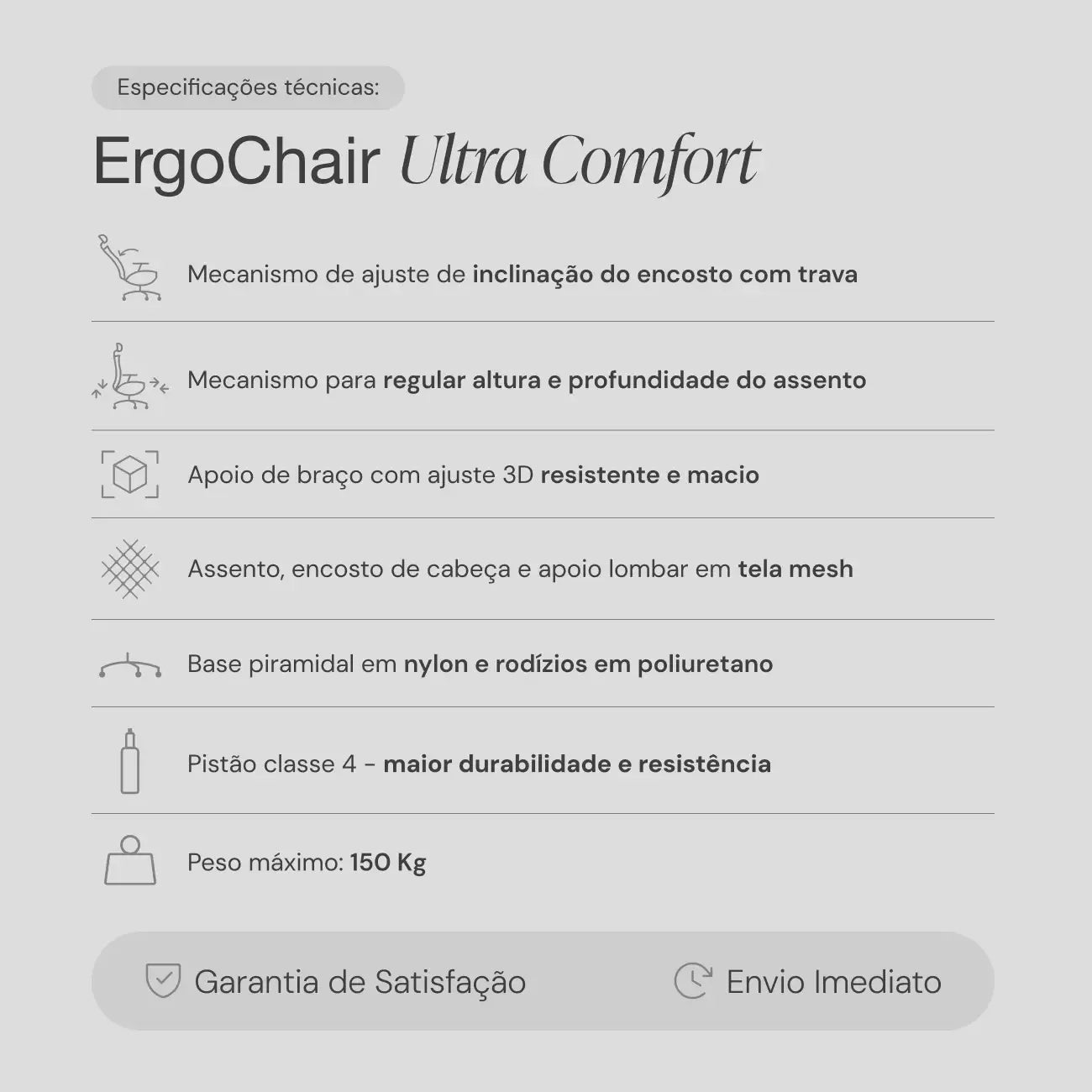 A Cadeira Premium ErgoChair Ultra Comfort dispõe de um encosto em tela mesh com regulagem de altura em até 5 níveis para acomodar biotipos diversos. Seu assento e encosto em tela Mesh premium para maior conforto respirabilidade. Há também o ajuste 3D dos apoios de braço, que também são produzidos em poliuretano, proporcionando maciez e resistência. E, um dos ajustes favoritos é a regulagem de profundidade do assento, onde é possível ajustar a distância entre o assento e o encosto, permitindo que haja maior espaço para as pernas.