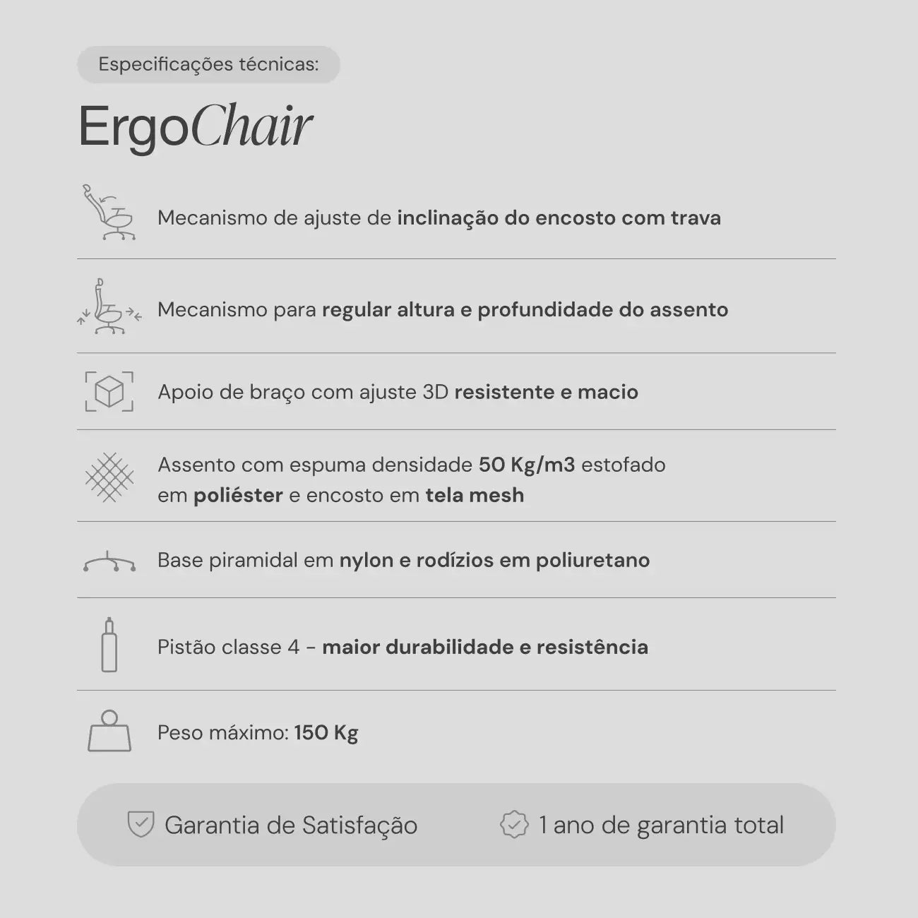 A Cadeira Premium ErgoChair dispõe de um mecanismo para percepção do peso do ocupante, onde o encosto com o ajuste e proteção para lombar reclinam-se conforme o peso se projeta na cadeira. Além disso, é possível regular a tensão desse mecanismo com o dispositivo posicionado na parte inferior do assento. O apoio de lombar da ErgoChair possui regulagem de altura em poliuretano. Seu assento é estofado em poliéster e seu encosto em tela Mesh. Há também o ajuste de altura dos apoios de braço, que também são produzidos em poliuretano, proporcionando maciez e resistência. E, um dos ajustes favoritos é a regulagem de profundidade do assento, onde é possível ajustar a distância entre o assento e o encosto, permitindo que haja maior espaço para ocupar a cadeira.