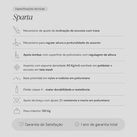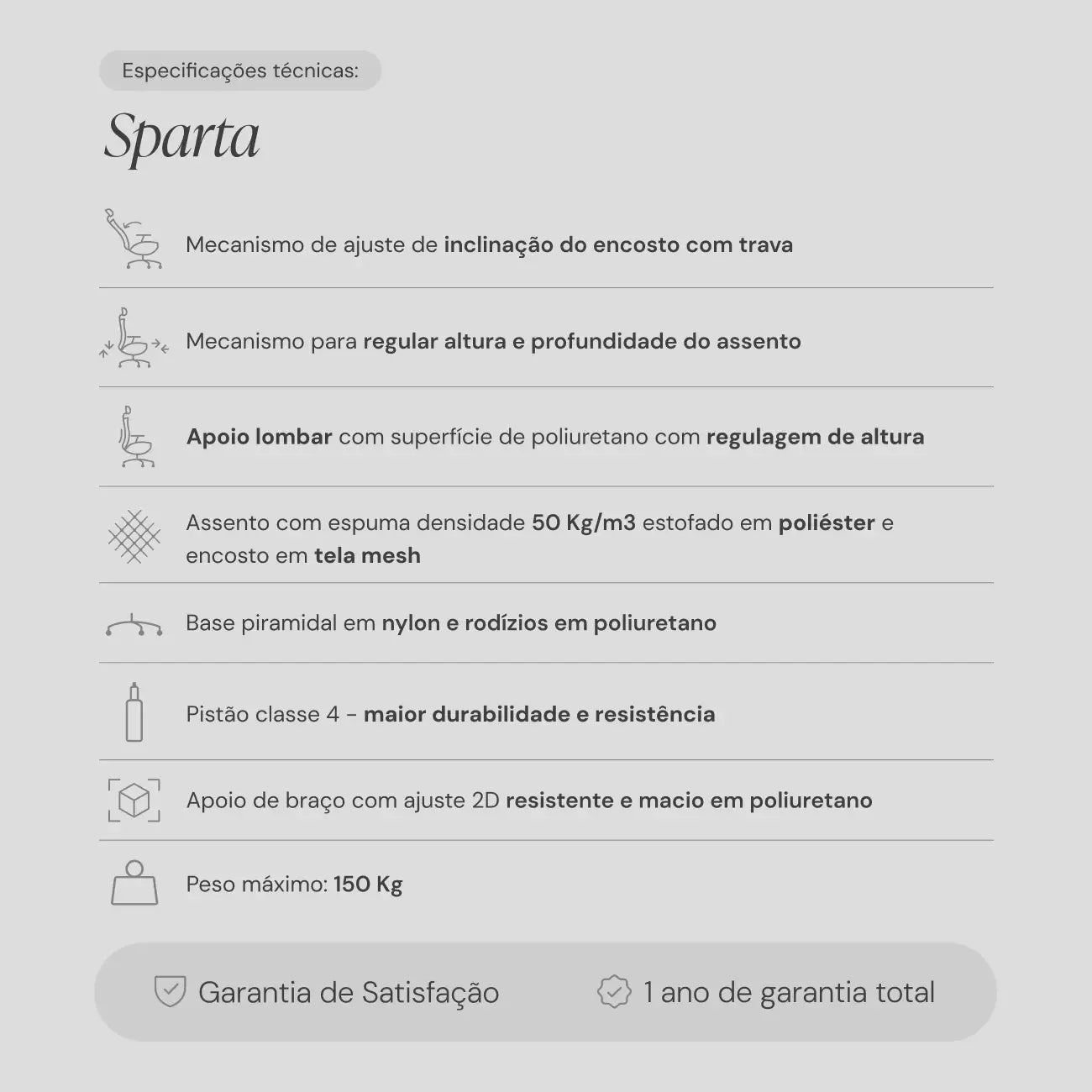 A cadeira Sparta foi projetada para oferecer conforto e ergonomia, especialmente para os usuários com estatura abaixo de 1,75 m. Com ajuste de altura do assento, apoio regulável de lombar e inclinação de encosto, a Sparta proporciona o suporte necessário para longas horas de trabalho sem comprometer o bem-estar. Seu assento em espuma e tecido garante uma experiência confortável, enquanto o apoio de cabeça e os braços ajustáveis em altura completam os ajustes essenciais para seu dia a dia no escritório ou home office.
