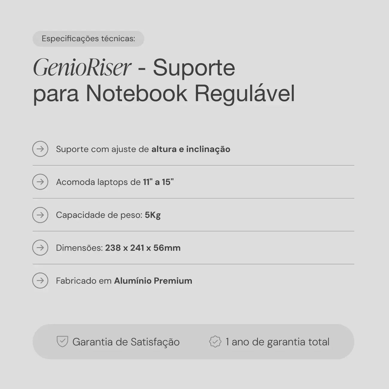 O GenioRiser é um suporte projetado para elevar a tela do seu notebook, proporcionando mais conforto e ergonomia para seu trabalho. Seu design com abertura mantém a máquina ventilada, evitando o superaquecimento e melhorando o desempenho.Compacto e fácil de usar, o GenioRiser se adapta a qualquer ambiente de trabalho.