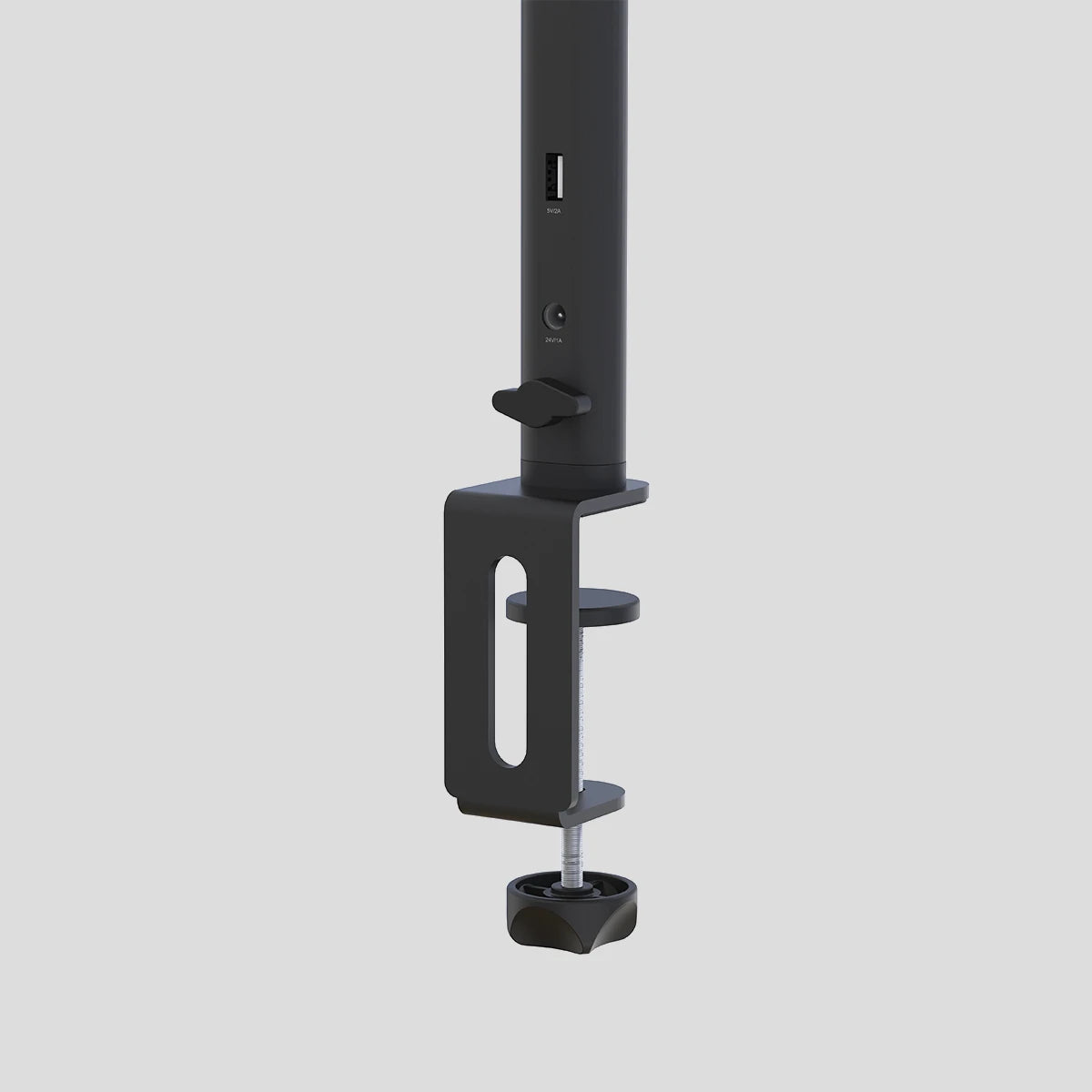 Fixação por clamp: Presa diretamente na borda da mesa, economizando espaço e garantindo estabilidade.