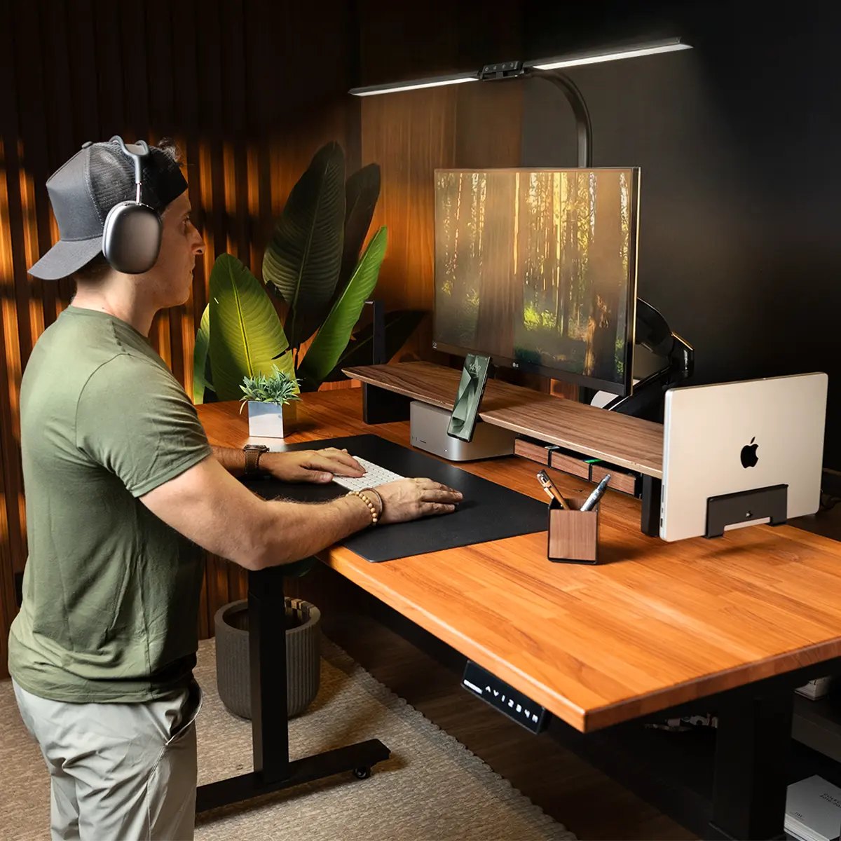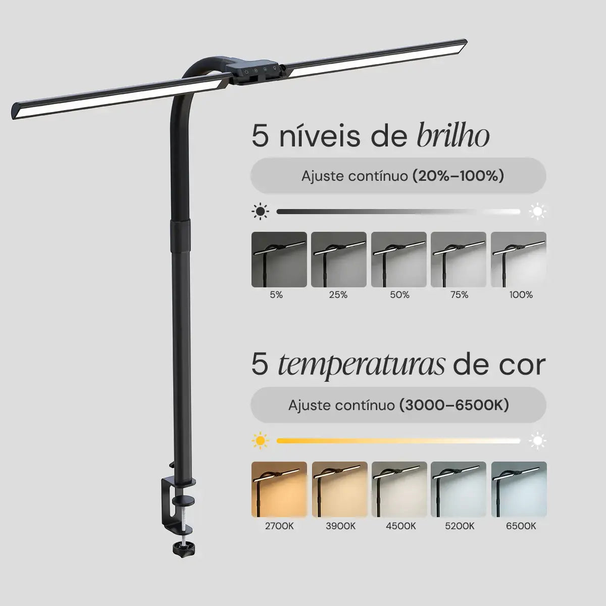- Iluminação super ampla: Barra horizontal extralarga que ilumina toda a superfície da mesa sem reflexos diretos nos olhos.