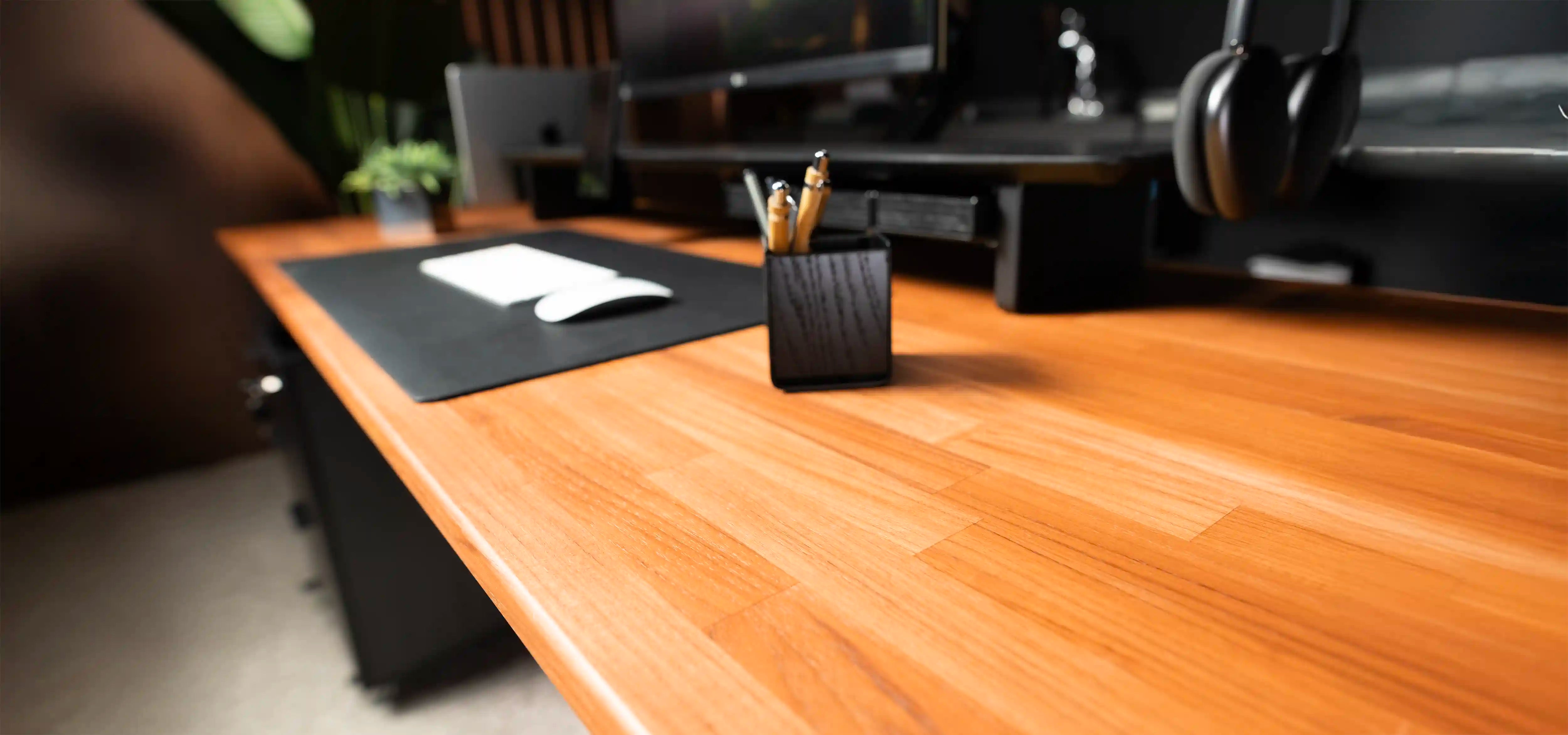 As estruturas metálicas são construídas em Aço com cortes realizados a laser. Todas as partes metálicas são soldadas utilizando maquinário robotizado, garantindo um acabamento impecável. Além disso, as estruturas recebem uma pintura eletrostática chamada Epóxi Pó. Essa técnica de pintura é destinada para revestimentos de materiais que necessitam de alta proteção com alto nível de acabamento. Os tampos convencionais de madeira são produzidos em MDP. Trata-se de um painel formado por três camadas de partículas de madeira, uma grossa no miolo e duas finas na superfície. Como resultado, o MDP é mais robusto e apresenta uma boa estabilidade e resistência a parafusos. Além disso, possuem revestimento melamínico de baixa pressão (BP) do fabricante Duratex que confere ao tampo maior resistência. O tampo ART é o primeiro dos nossos tampos Premium, produzido de forma artesanal em madeira teca maciça de árvores adultas com plantações iniciadas há mais de 20 anos e manejadas para a produção sustentada.