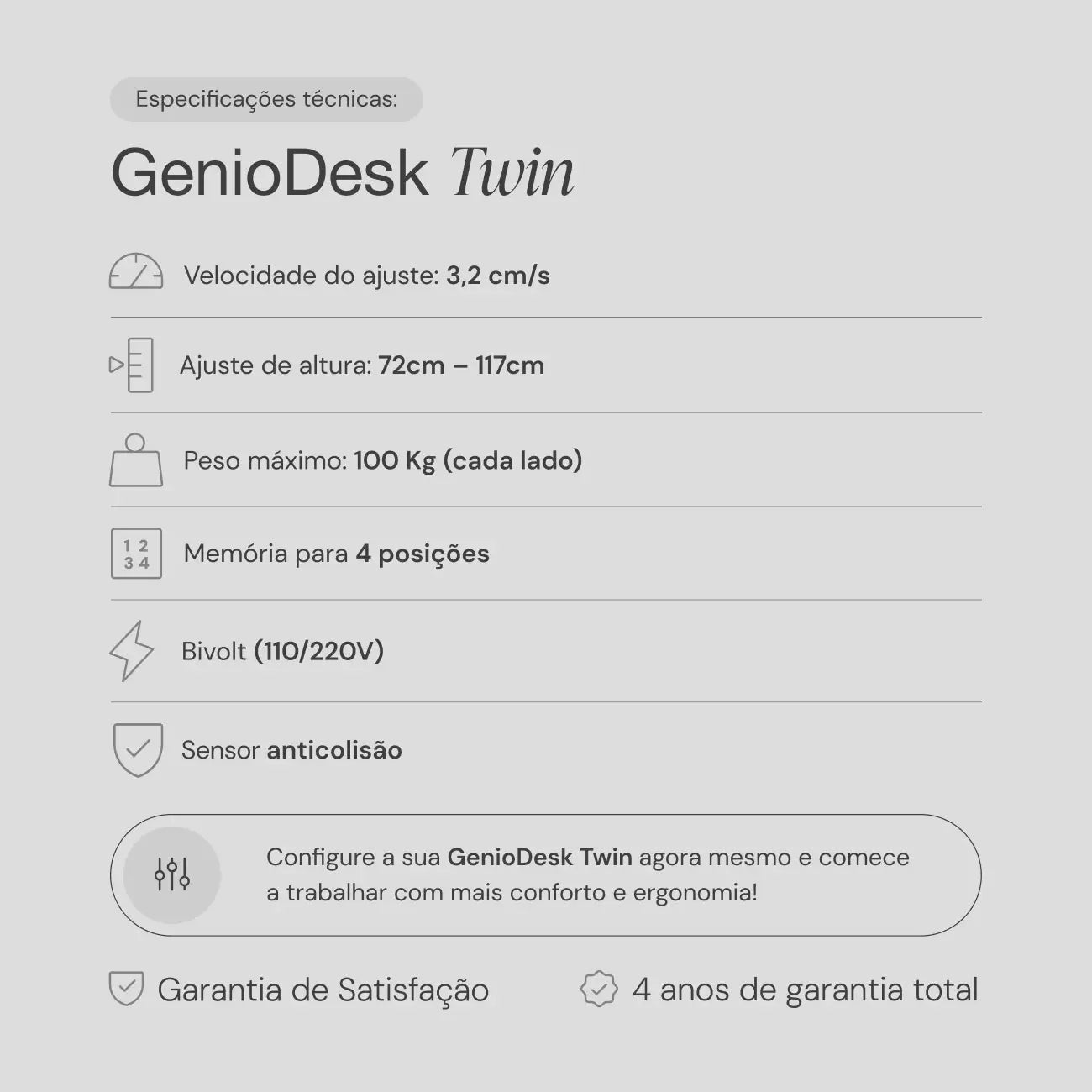 Configure a sua GenioDesk Twin agora mesmo e comece a trabalhar com mais conforto e ergonomia!