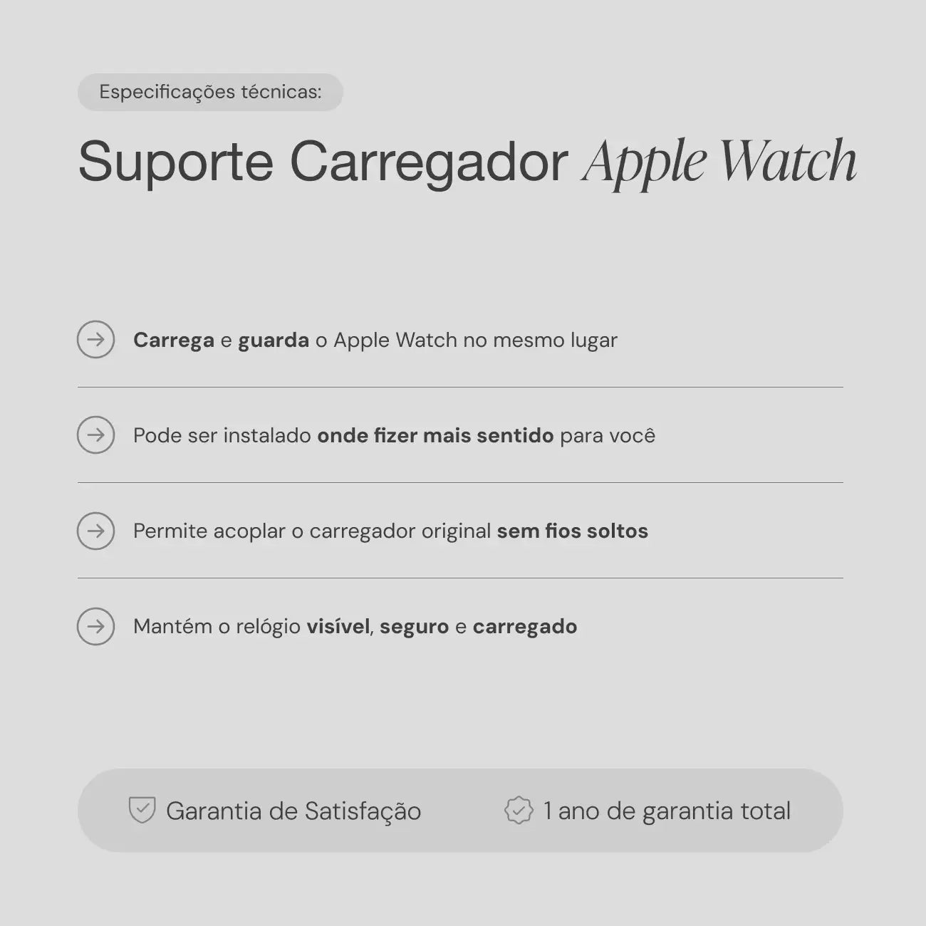 Carregue e guarde seu relógio no mesmo lugar. Pode ser posicionado onde fizer mais sentido para você, mantendo o Apple Watch visível, seguro e sempre por perto. Permite acoplar o carregador original, evitando fios soltos e garantindo que o relógio esteja sempre carregado.