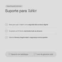 Um item pensado para quem utiliza o tablet como segunda tela, painel de controle ou bloco digital de anotações. Instalado na parte frontal do M-Stand, o suporte oferece uma base firme, ângulo ideal e segurança contra quedas.