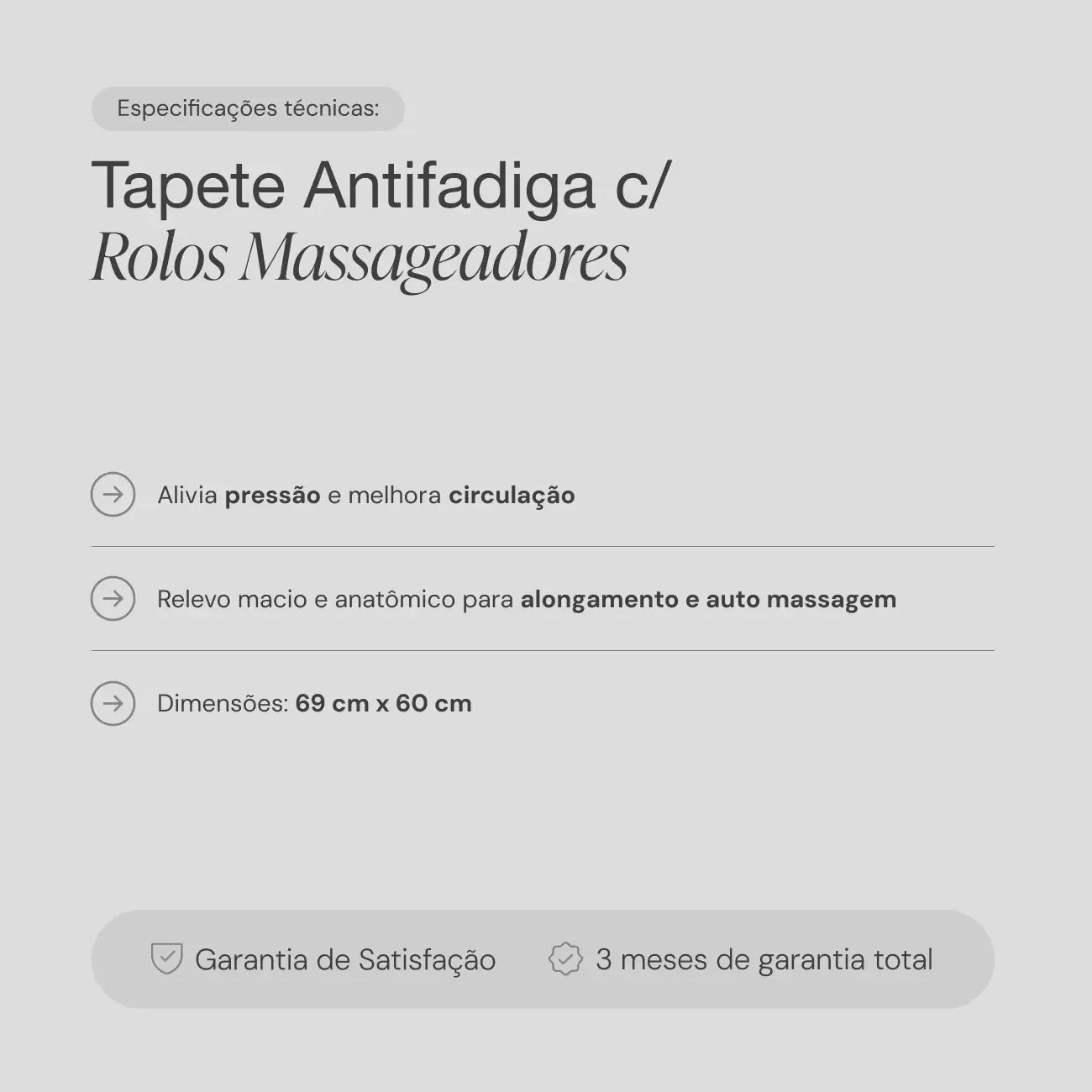 Este tapete antifadiga foi criado especialmente para quem usa mesa com regulagem de altura no trabalho. Com um design exclusivo que inclui rolos massageadores móveis, pontos de acupressão e áreas massageadoras, ele ajuda a aliviar a tensão e dores nos pés, pernas, joelhos e tornozelos.